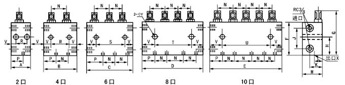 4、在分配器上下對應出油口間設有合二為一的出油結構,易改奇數(shù)出油,使用時只需將孔內的螺釘擰出,把上或下不用的那個出口用R1/4 螺塞封堵即可。