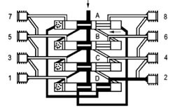 當(dāng)活塞D打通通向活塞A左側(cè)終端的連接通道后,潤滑劑流動并將活塞A向右推動。位于活塞A前右側(cè)的潤滑劑輸送到排出口1。