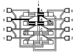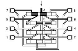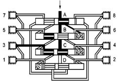 這時活塞B至D從左側(cè)向右側(cè)運動,按以上相反方向順序動作完成一個周期循環(huán)并可重新開始一個新的循環(huán)。