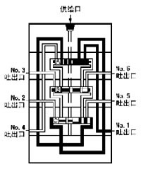 4、流入的潤滑劑推動活塞A向左移動、左腔的潤滑劑壓向NO.3吐出口經(jīng)外部配管送向潤滑點(diǎn)。當(dāng)活塞A運(yùn)動至左極限時(shí)活塞C右腔開始進(jìn)入潤滑劑。