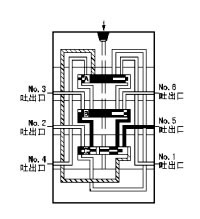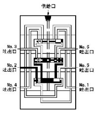 6、流入的潤滑劑推動活塞B向右運(yùn)動、右腔的潤滑劑壓向NO.5吐出口,經(jīng)外部配管送向潤滑點(diǎn)。當(dāng)活塞B移動到至右極限時(shí)活塞A左腔開始進(jìn)入潤滑劑。