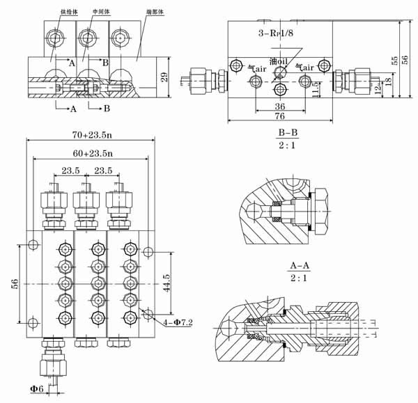 SMX*-YQ型油-氣分配混合器,是由模塊式的單線遞進(jìn)分配器和混合器組合疊加而成。設(shè)有一個(gè)進(jìn)油口,二個(gè)進(jìn)氣口,3~16個(gè)油氣出口。適用于單線二分式油氣潤(rùn)滑系統(tǒng)和雙線-遞進(jìn)式油氣潤(rùn)滑系統(tǒng)中。